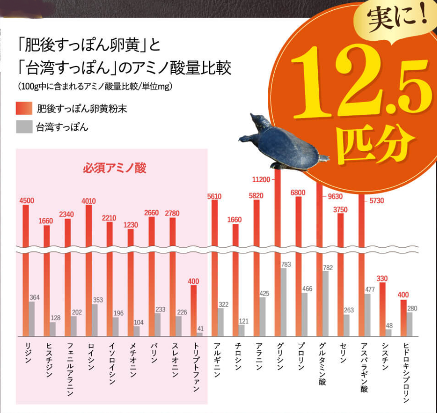 ナント、台湾すっぽんと比べて12.5倍のアミノ酸量を誇ります。